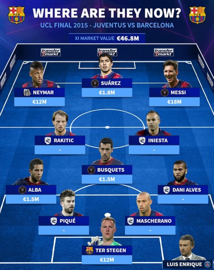 德转列巴萨2015欧冠决赛首发当前情况:身价(欧元)